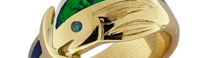 18 carat yellow gold and Palladium with blue/green diamond and blue/green opal inlay.