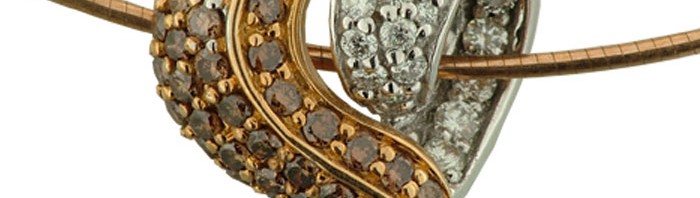 18 carat white gold and 18 carat rose gold with cognac diamonds and white diamonds on a 18 carat rose gold neck wire.