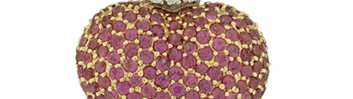 18 carat white gold and 18 carat yellow gold with diamonds and Rhodolite garnets.