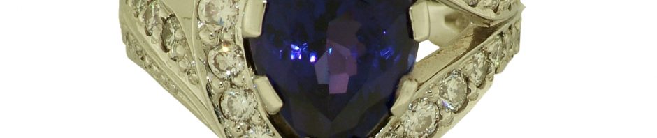 A natural untreated Tanzanite gemstone Handmade with diamonds in platinum and finger-shaped band for very special clients who gave free reign on the design. Please contact us about your commission
